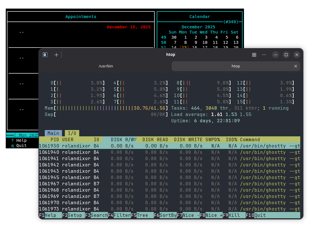 Ghostty handled my resize and update tests with ease. I used a triple split screen and dual tabs, all running htop, which means multiple splits and two tabs running the same constant updates. To make the test a little more taxing, I put on one the Main tab and the other on the I/O tab.