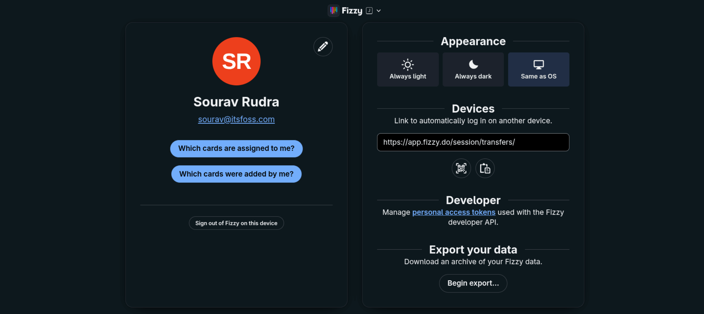 The board and user profile settings on Fizzy.