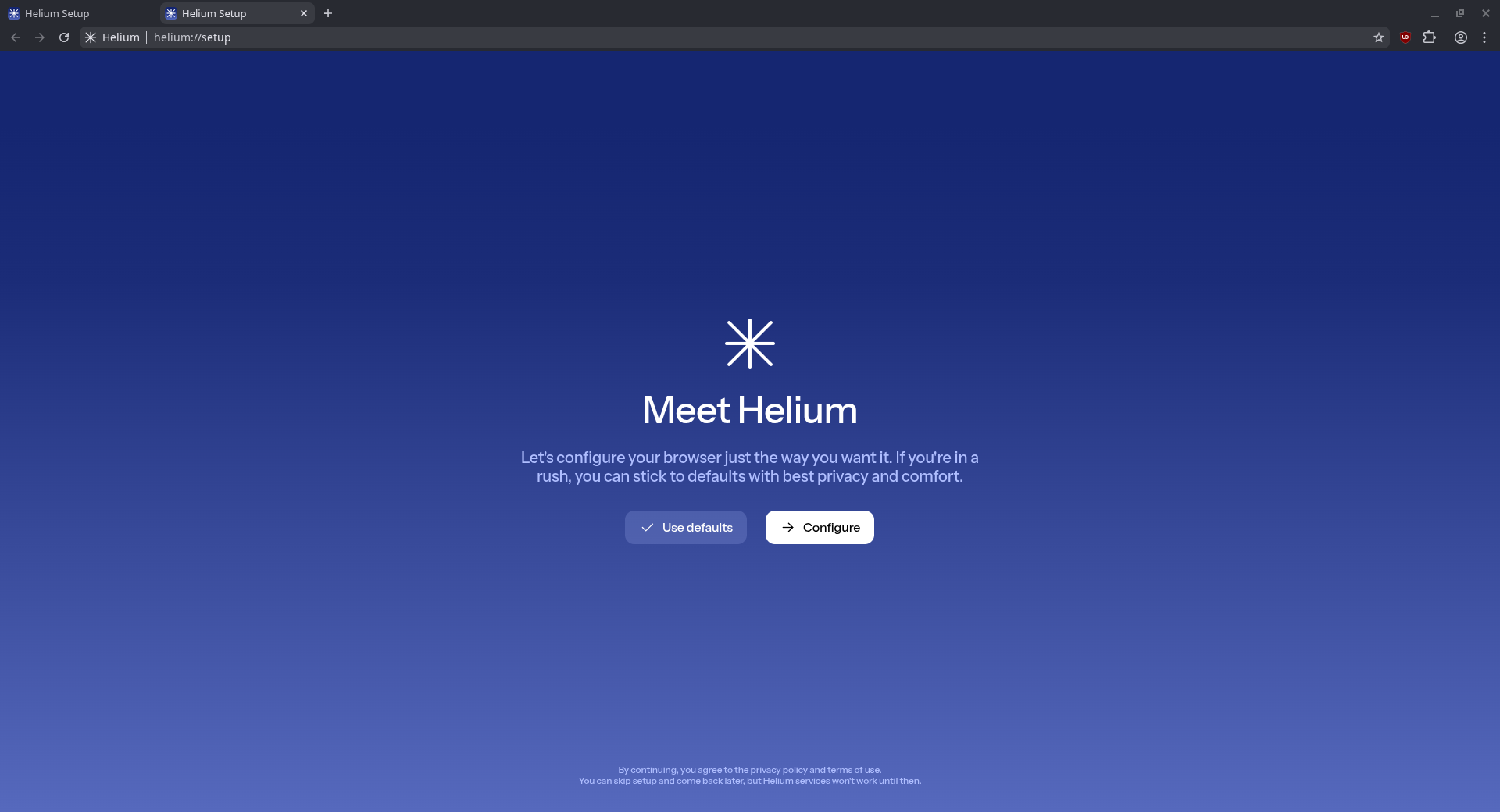 Helium's biggest selling point is evident from the first run. First, you'll notice the presence of uBlock Origin, made possible by the browser's preservation of Manifest V2. You're also presented with the option to either use the default settings, or configure Helium to your liking.