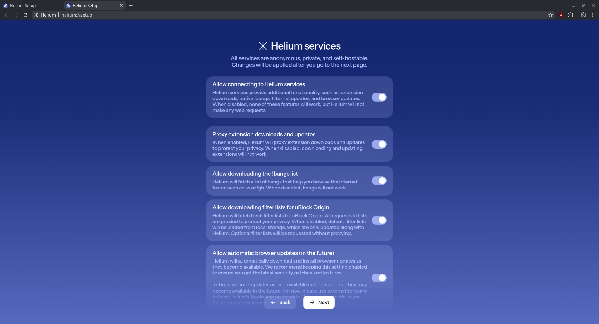 If you choose to configure, you're presented with toggles for various features, most of which relate to how Helium protects your privacy. All features require you to enable the browser to connect to "Helium services", which are basically a privacy-protecting wrapper to anonymize external connections.