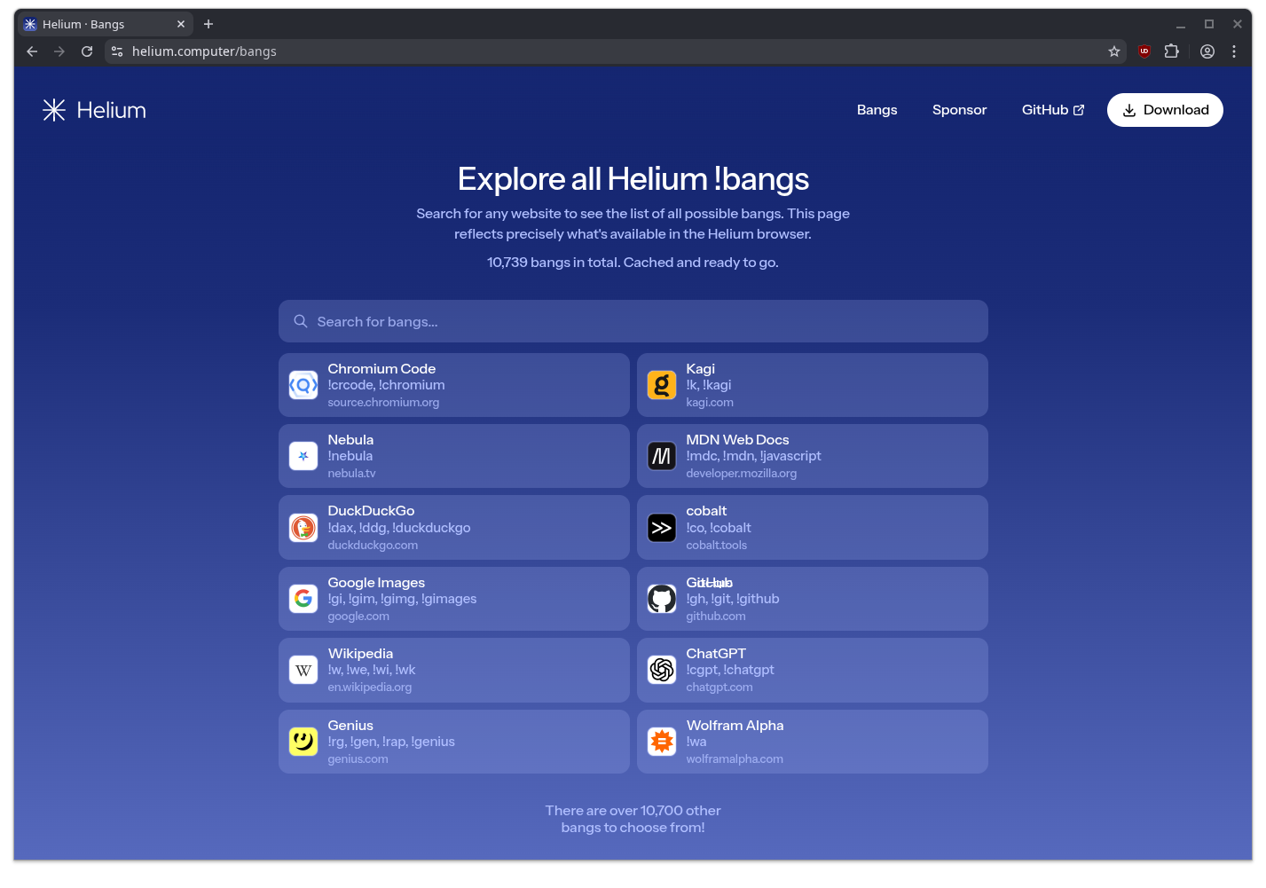 Helium contains a cached list of 10,739 bangs, including some that allow you to run privacy-respecting queries of popular AI tools such as ChatGPT. Of course, there are still some areas for improvement.