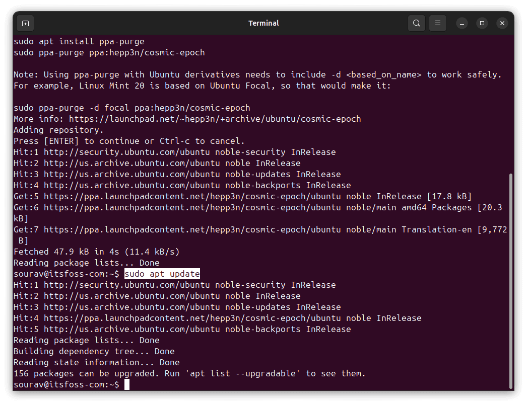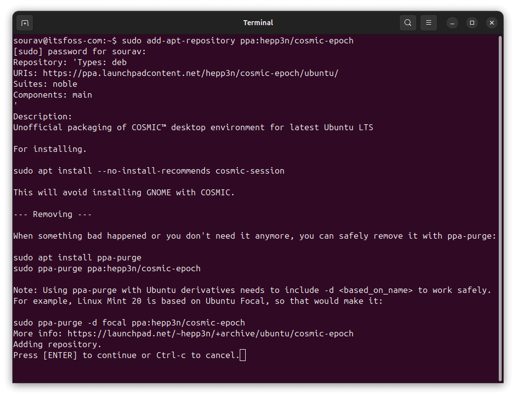 sudo add-apt-repository ppa:hepp3n/cosmic-epochThe system will ask for your password and show you information about the PPA. Press Enter to confirm.