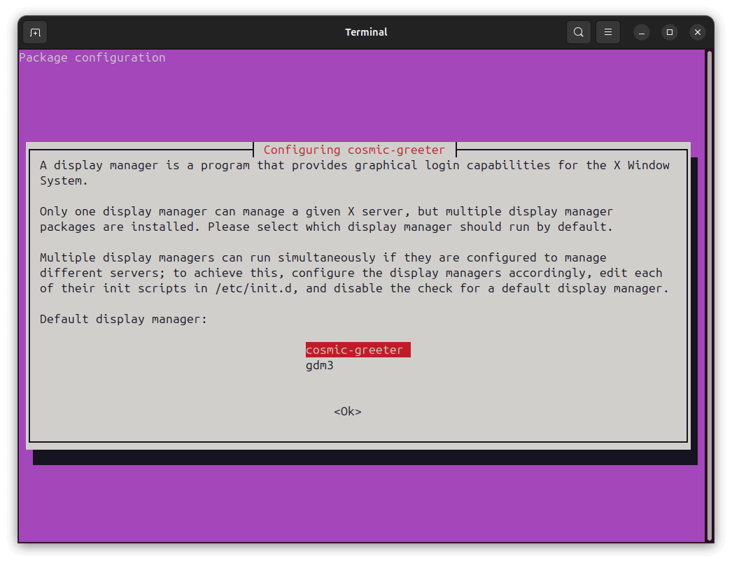 If you want to go full COSMIC, select cosmic-greeter. This is what I did during my testing. But if you plan to keep using GNOME or want to switch between desktop environments, stick with gdm3 (GNOME Display Manager).