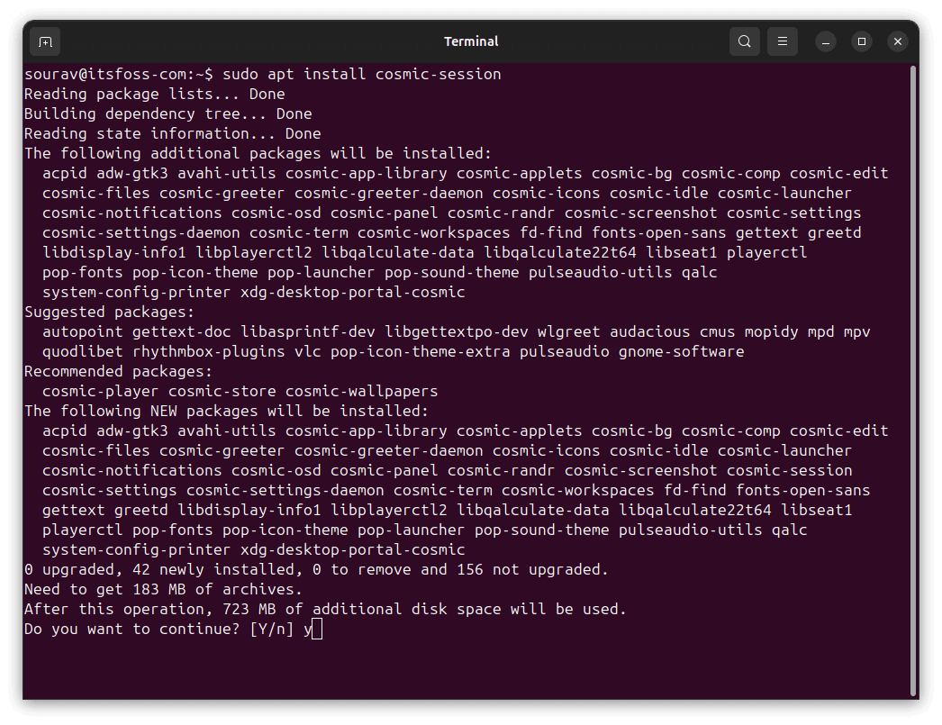 You add the unofficial PPA with sudo add-apt-repository ppa:hepp3n/cosmic-epoch and then install COSMIC desktop with sudo apt install cosmic-session. Once installed, log out from the system and choose COSMIC session from the login screen.