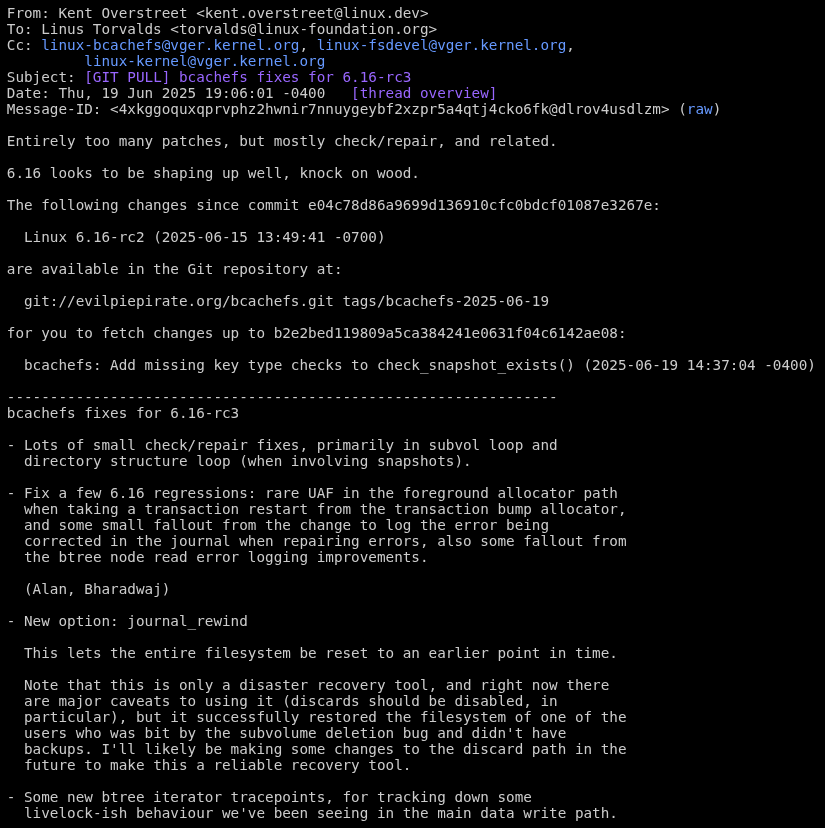 You can follow the full story by checking the Linux kernel 6.16-rc3 and Linux kernel 6.16-rc4 mailing list threads related to Bcachefs.