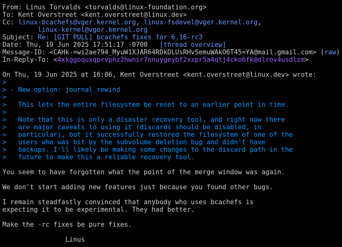 You see, recently, Kent filed a pull request to add a new feature called "journal-rewind" It was meant to improve bcachefs repair functionality, but it landed during the release candidate (RC) phase, a time usually reserved for bug fixes, not new features, as Linus pointed out.
