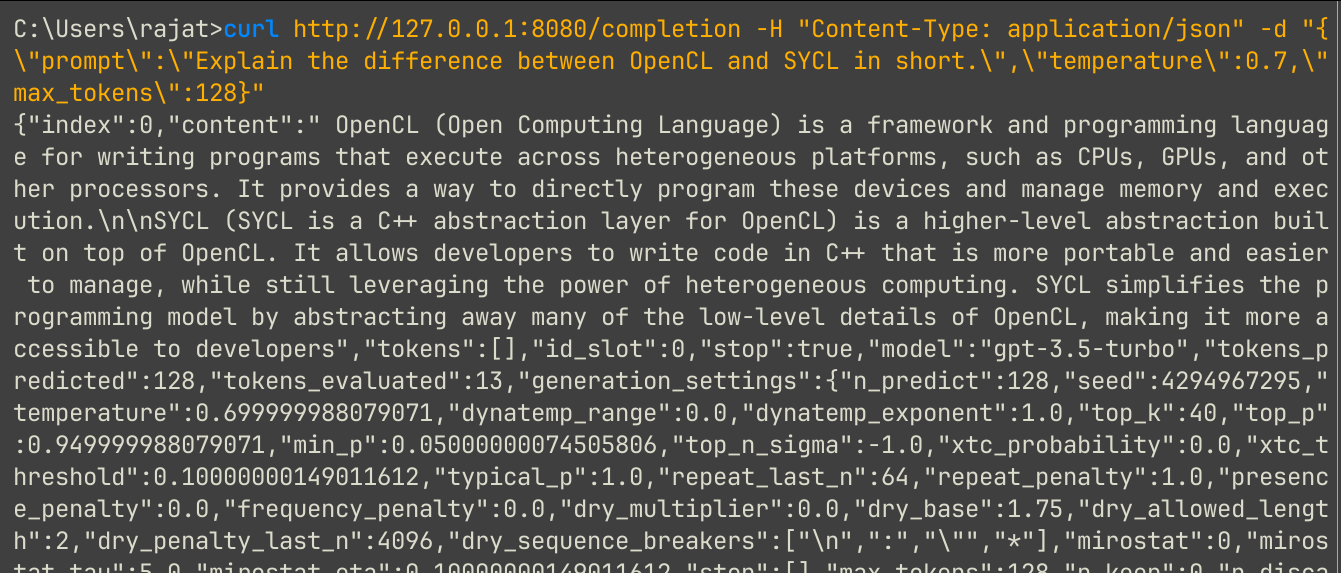 curl http://127.0.0.1:8080/completion -H "Content-Type: application/json" -d "{\"prompt\":\"Explain the difference between OpenCL and SYCL in short.\",\"temperature\":0.7,\"max_tokens\":128}