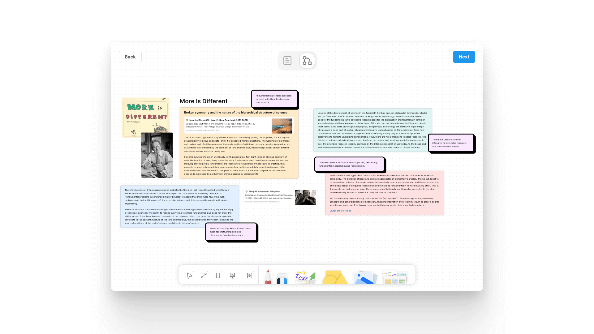 I used the toolbar at the bottom, which houses useful tools like selection tool, framing tool, line tool, linking tool, controls for adding rich text notes, pen, eraser, shape tool, asset library, and more.