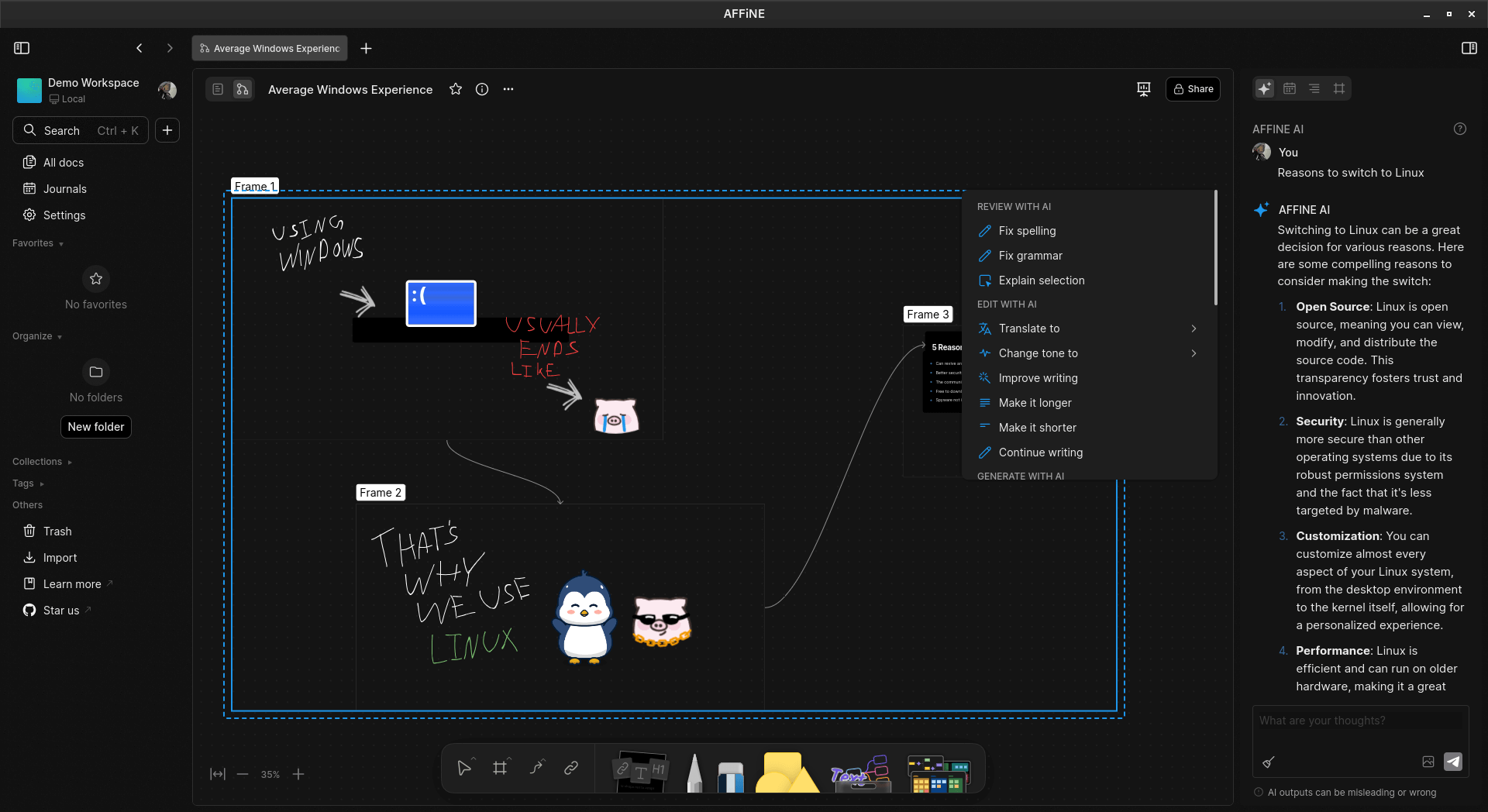 AFFiNE's AI-powered features in action.