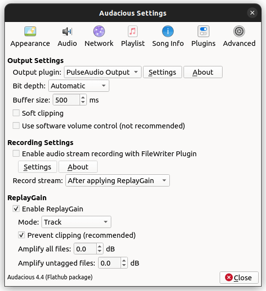 Initially, when I started Audacious up on my Ubuntu 22.04.4 laptop, there was no audio output from the speakers. To fix that, I had to go into the settings and change the output plugin setting to use PulseAudio Output, as my setup was using PulseAudio on PipeWire.
