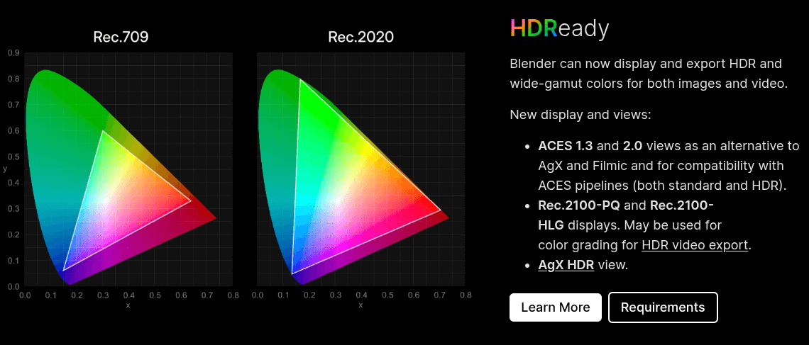 The color pipeline now supports HDR and wide gamut colors for images and video. You get new display options like Rec.2100-PQ, Rec.2100-HLG, and AgX HDR. Using HDR on Blender requires a compatible monitor, Vulkan backend on Windows and Linux, and Wayland on Linux. Apple Silicon Macs work out of the box.