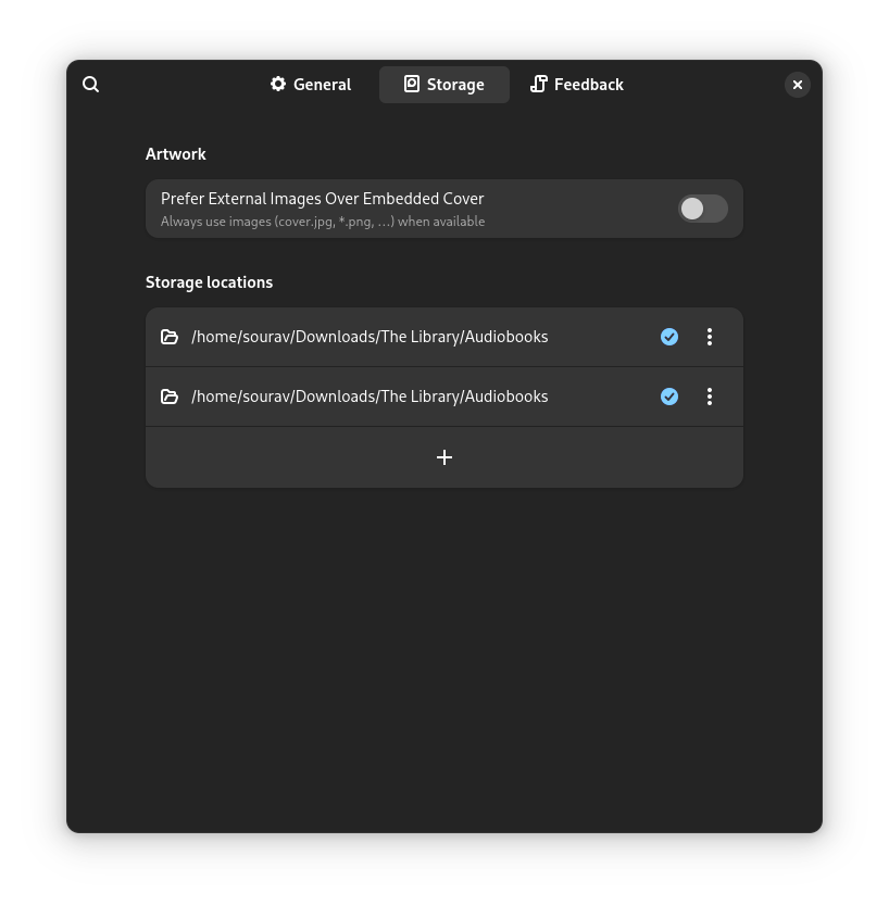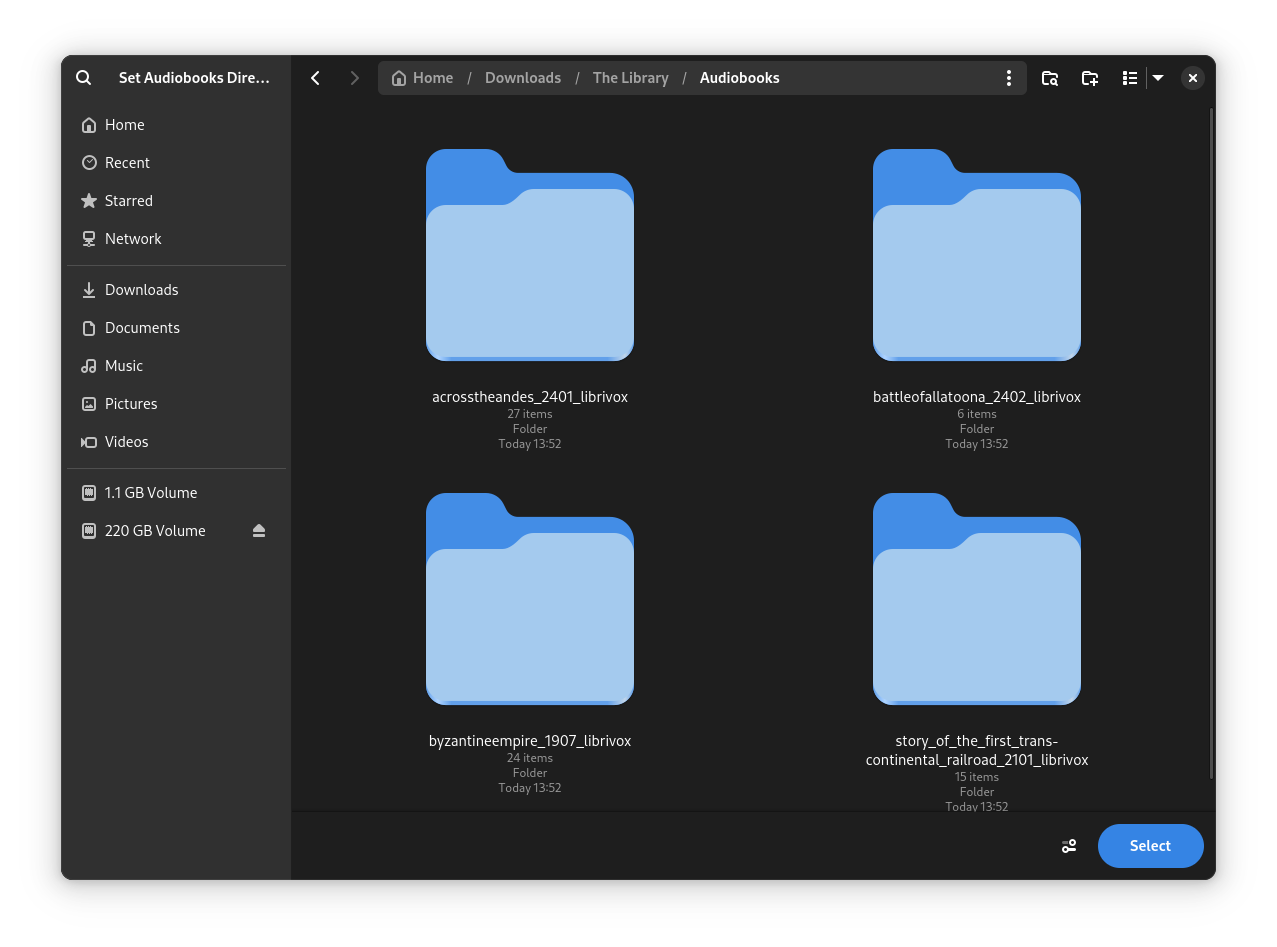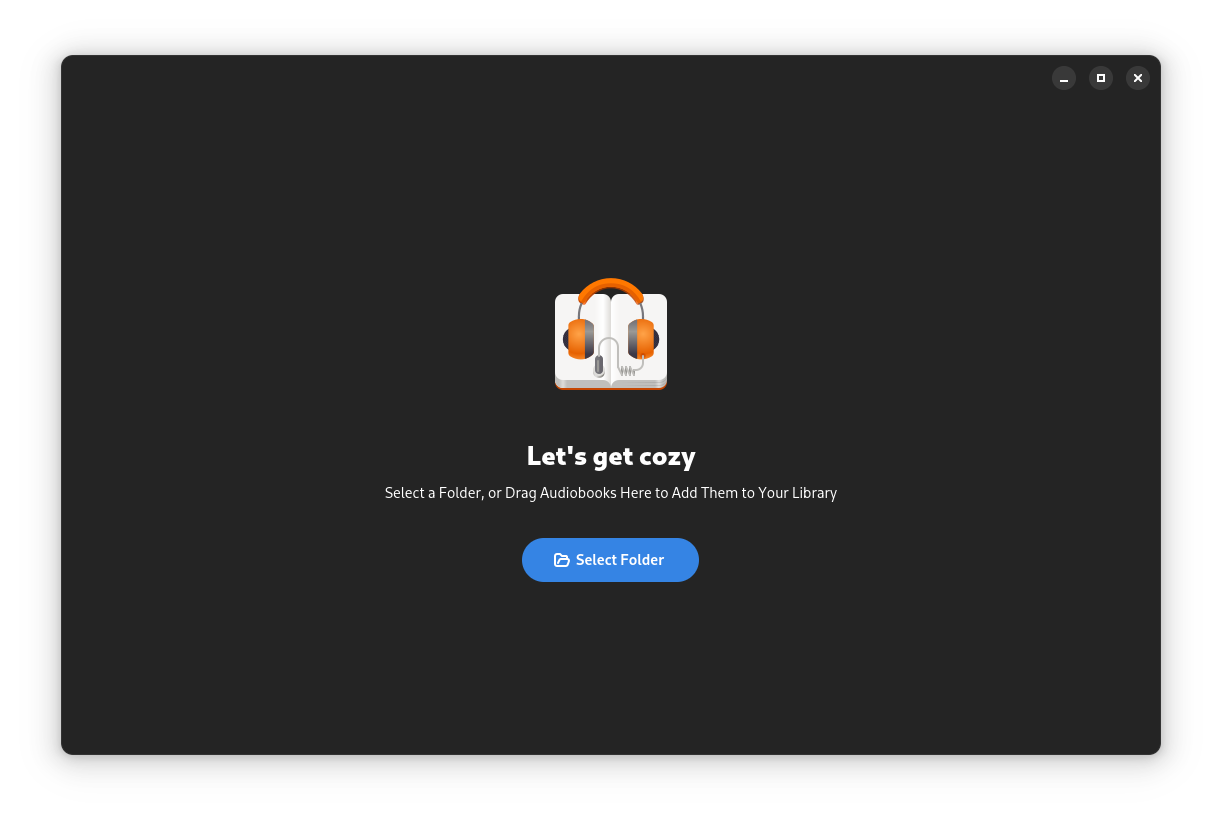 On first start, Cozy asked me to add/drag a new folder for it to start adding audiobooks to the library. I clicked on the big blue โSelect Folderโ button and added a folder containing my audiobooks.