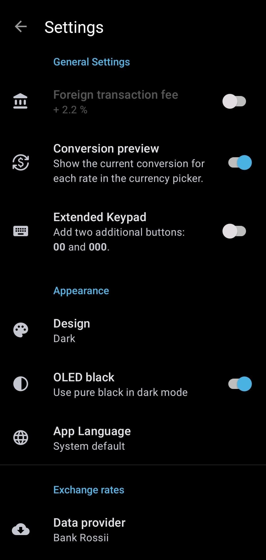 It also has some other useful options to enable previews of conversions in the currency list, extend the number pad, use a pure black skin for OLED displays, and some language controls.
