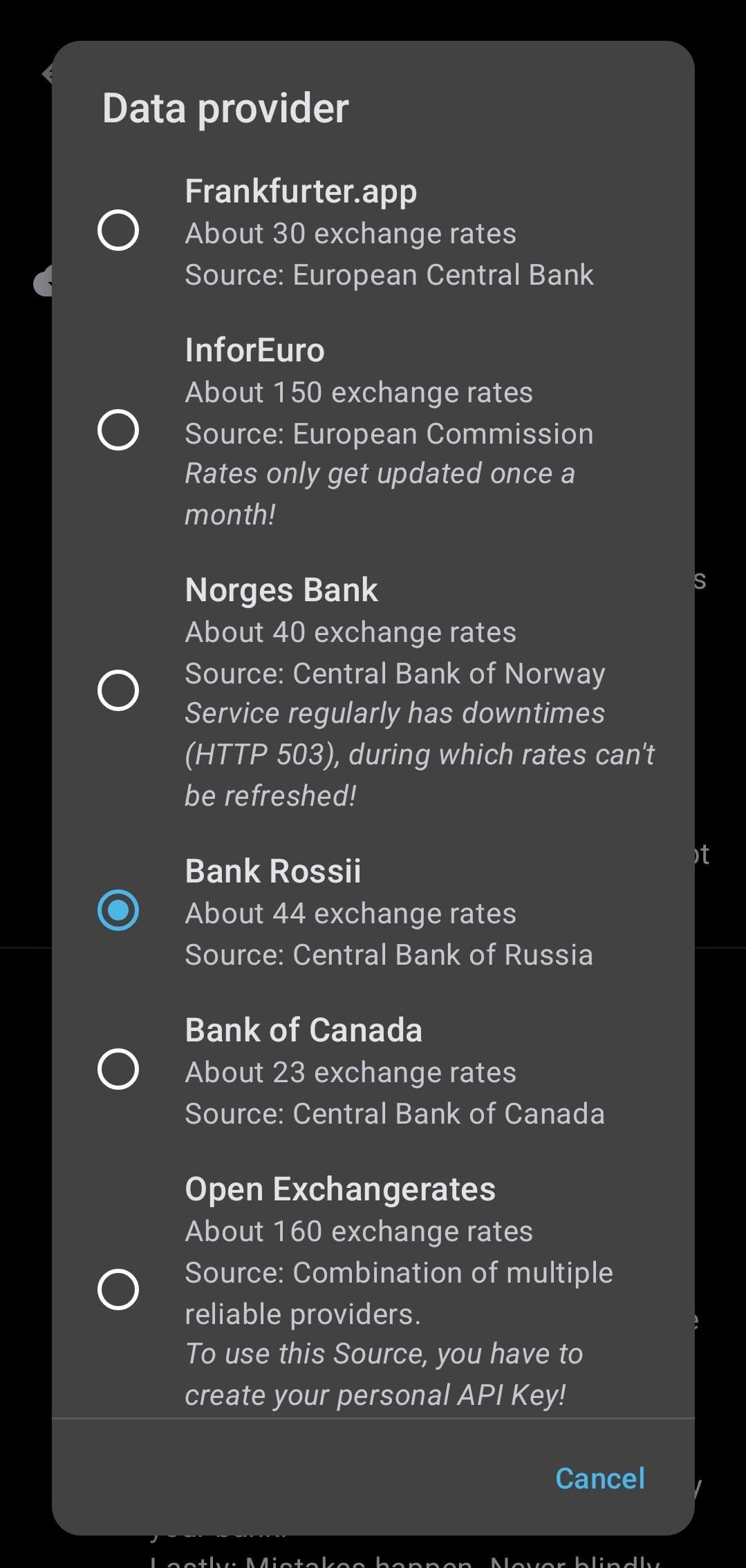 If you don't prefer the default choice, then the settings menu has some other data providers like Norges Bank, InforEuro, Frankfurter.app, Bank of Canada, and Open Exchange Rates (requires an API key) to choose from.