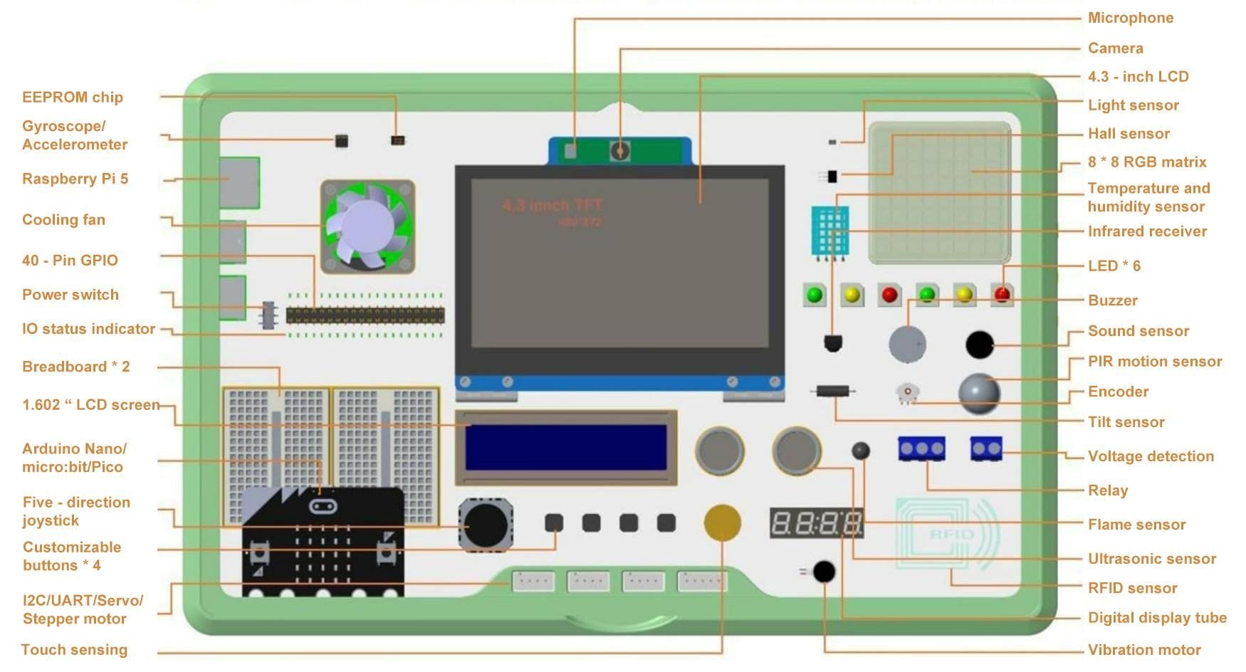 There is a range of input and output sensors too, that include a gyroscope/accelerometer, RFID, flame detection, voltage detection, ultrasonic, PIR sensing, infrared reception, temperature/humidity, hall sensing, and a few others.