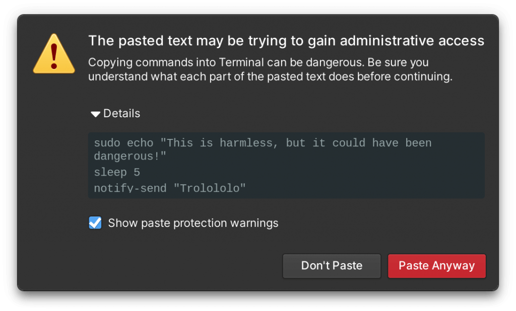 - You get a warning if you try to paste a command that needs root access in the terminal.