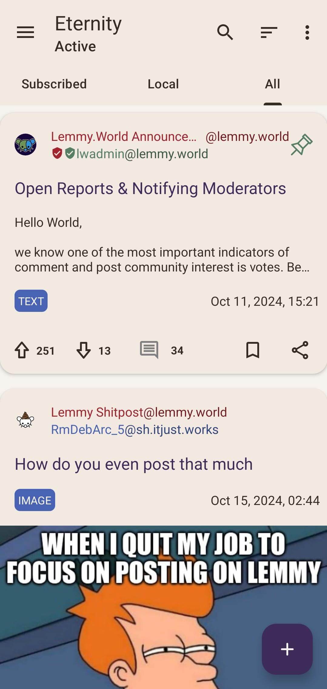 At first launch, I was taken to an empty βSubscribedβ page with no content. I then logged into my Lemmy.world account and went into the βAllβ page. It showed me a pinned post by the admins of the instance, followed by many random posts from other communities.