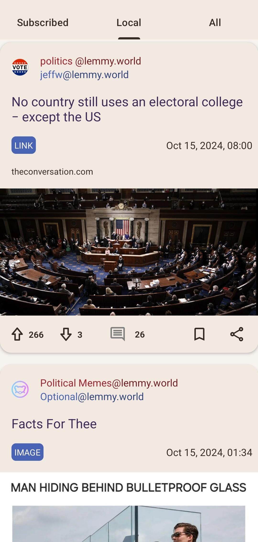 After logging in, the feeds started filling up, with the βSubscribedβ tab showing my subscribed feeds and the βLocalβ feed showing US-focused posts.