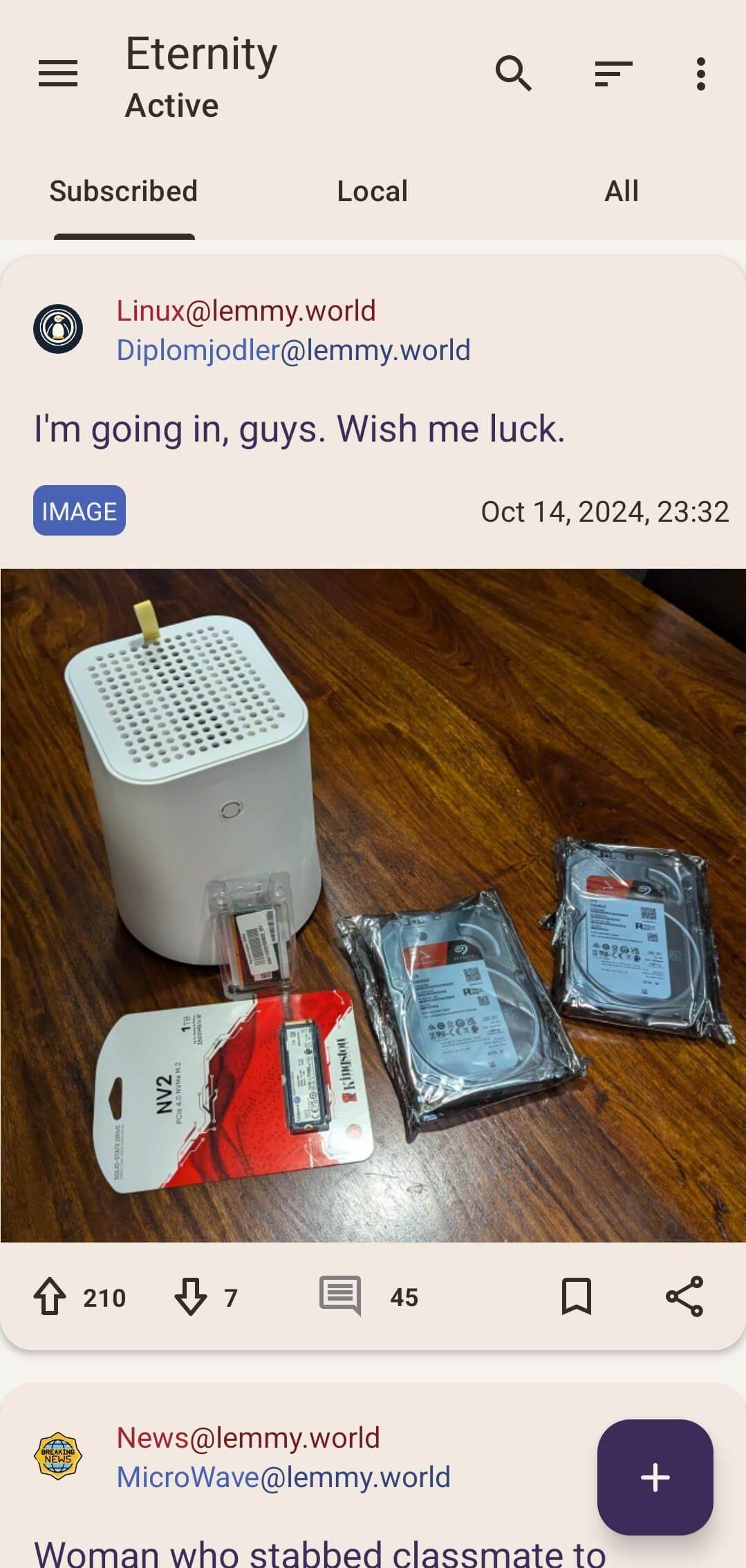 Eternity's local and subscribed feeds, with a post from one of those opened.