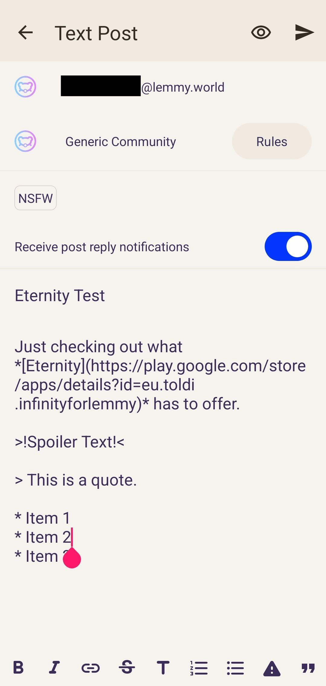 The post editing experience is superb too, with rich text editing making things easier, and readable. Before sending a post or even a comment, I can see a preview by clicking on the eye symbol to weed out any mistakes.