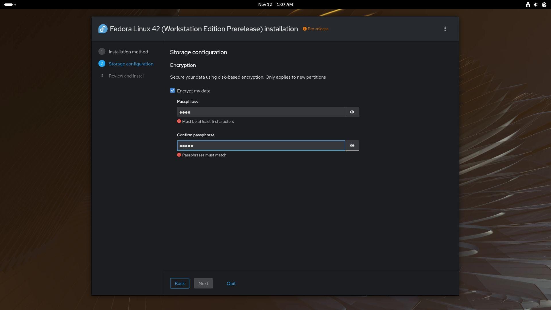 I fired up the provided test ISO for Anaconda Web UI, which was powered by Anaconda 42.13 and running on Firefox 132.0.1. At first glance, the user interface felt familiar, and I could manage the disk partitions, enable encryption, and review the installation before it began.