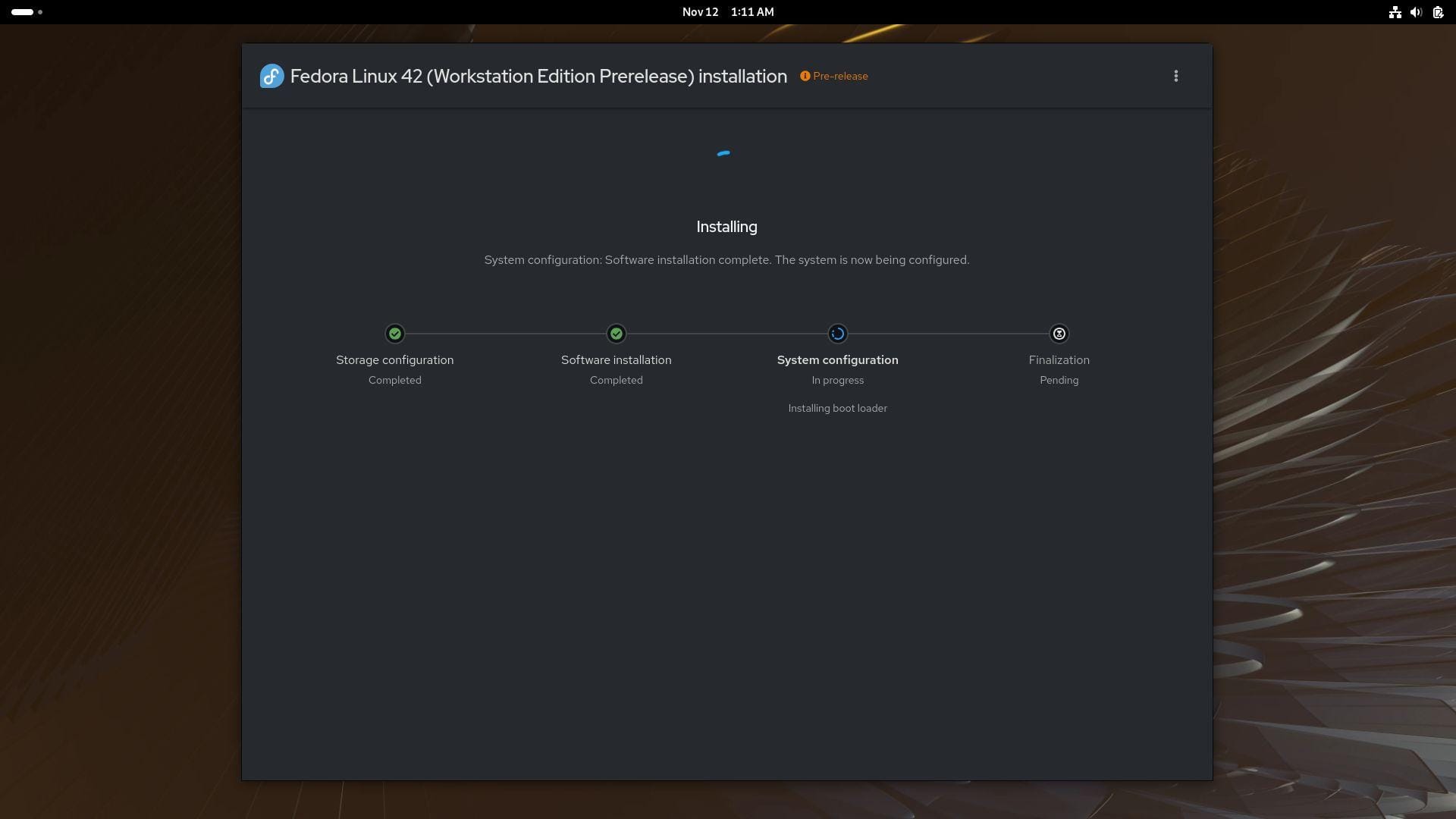 During installation, handy progress spinners were shown on all the stages, like Storage configuration, Software installation, System configuration, and Finalization.