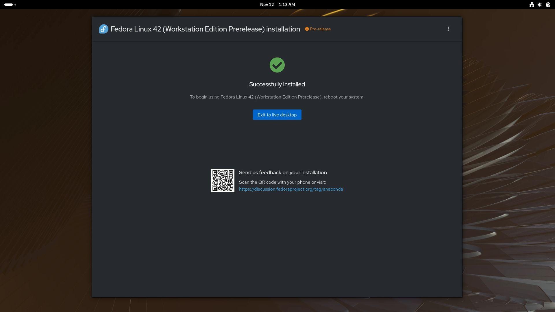 In the final stage, Anaconda Web UI prompted me to reboot my system to use the Fedora 42 Workstation installation, with a feedback call-to-action at the bottom accompanied by a QR code.
