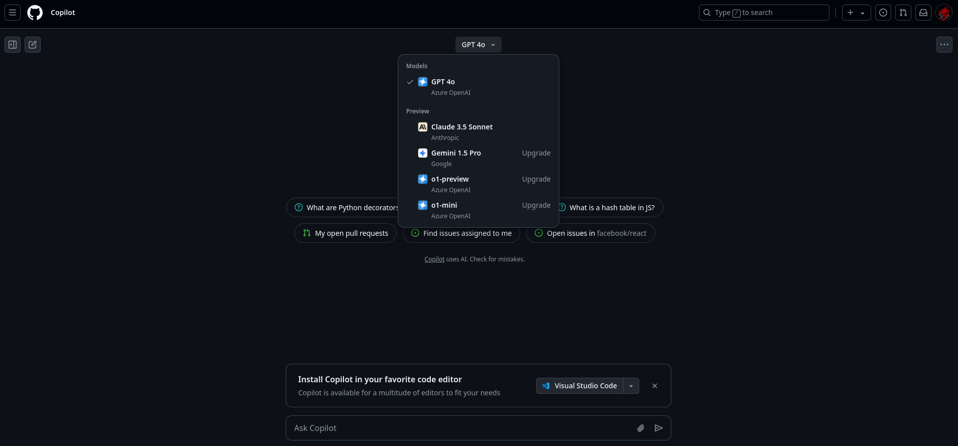 As you can see above, the free tier provided me with access to Open AI's GPT 4o and Anthropic's Claude 3.5 Sonnet, with a prompt above the text box nudging me to install Copilot on my favorite code editor.