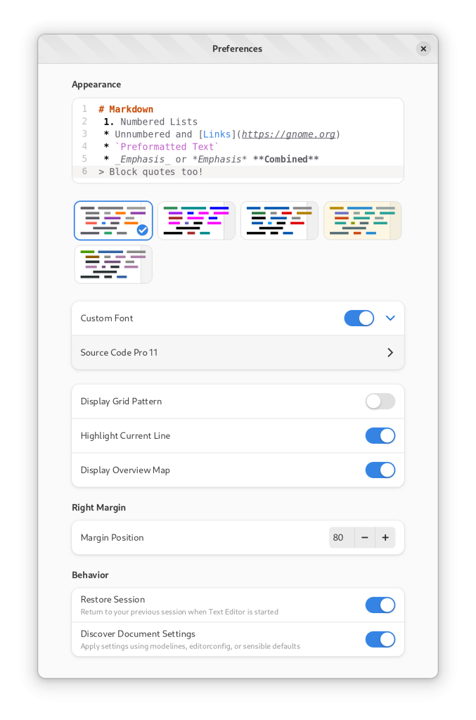The upcoming release for GNOME’s text editor will let you easily apply different style-scheme (or themes) that affects the entire application.