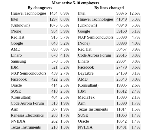 Intel and Huawei Technologies are among the top 2 contributors here. To be specific, the contribution by the developers working for Intel is 12.6% (with 96976 lines changed) and 8.0% by the number of changesets.