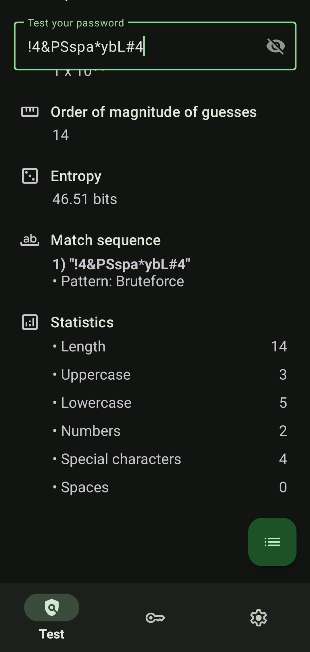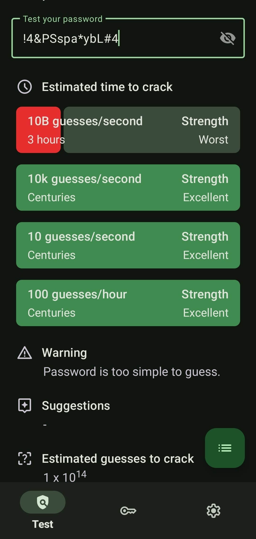 In my usage, IYPS performed well on an Android 14 smartphone. I copied over a password generated by Bitwarden to see how it fared, and it almost passed with flying colors, except in the 10B (billion) guesses per second test.