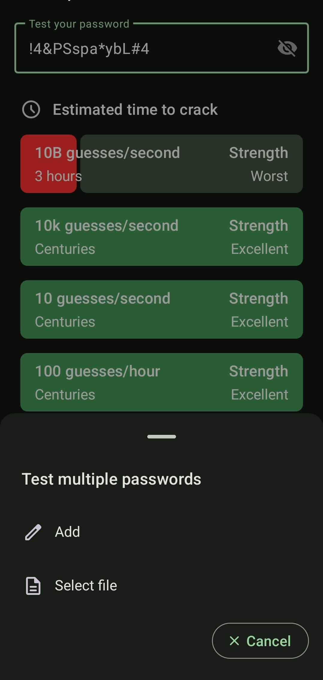 I could also add multiple passwords at once by manually entering them or from a file for evaluation by the app.