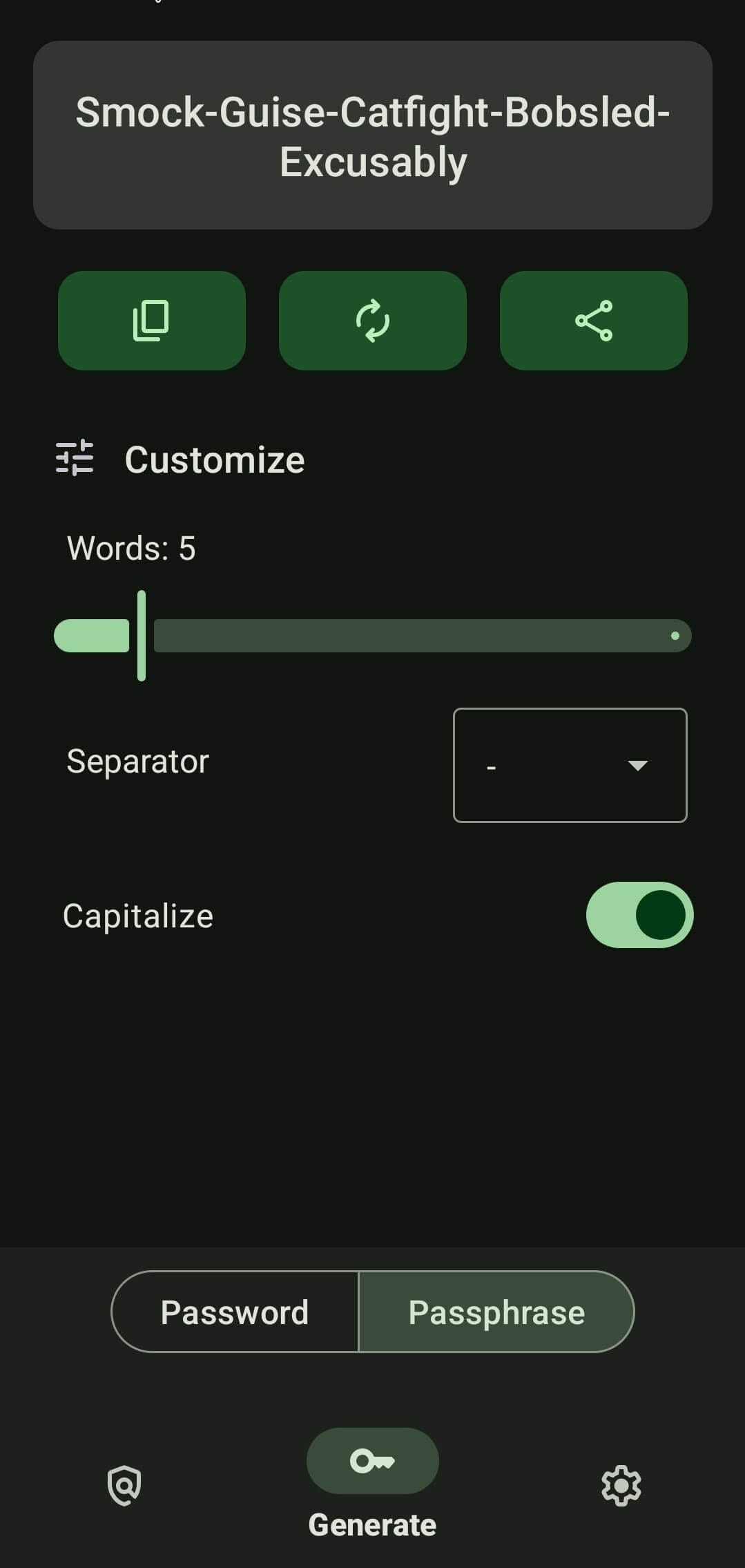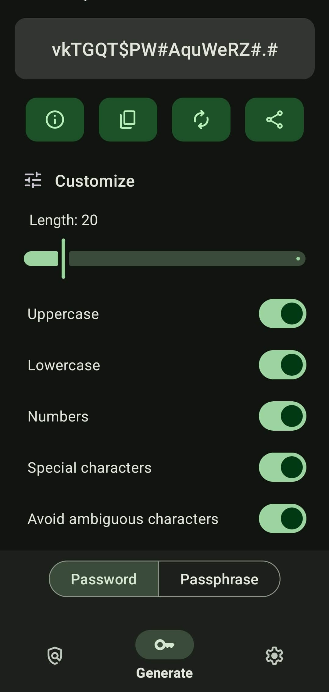 There is also a handy password and passphrase generator on-board, with a range of options to tweak the output, copy content into the clipboard, run an evaluation of it, and even share it using apps installed on the phone.