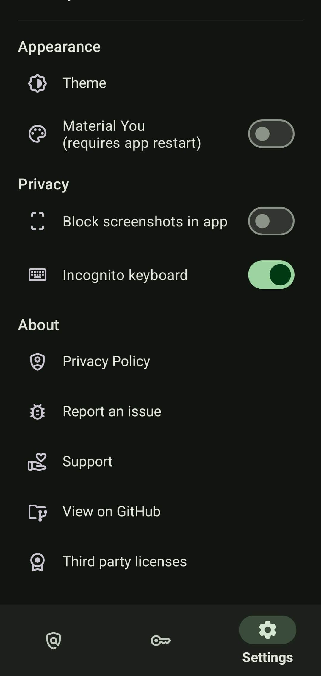 The Settings menu is minimal, with controls for adjusting the appearance and privacy-focused options to block screenshots in the app and to enable incognito keyboard (prevents keyboard apps from storing data).