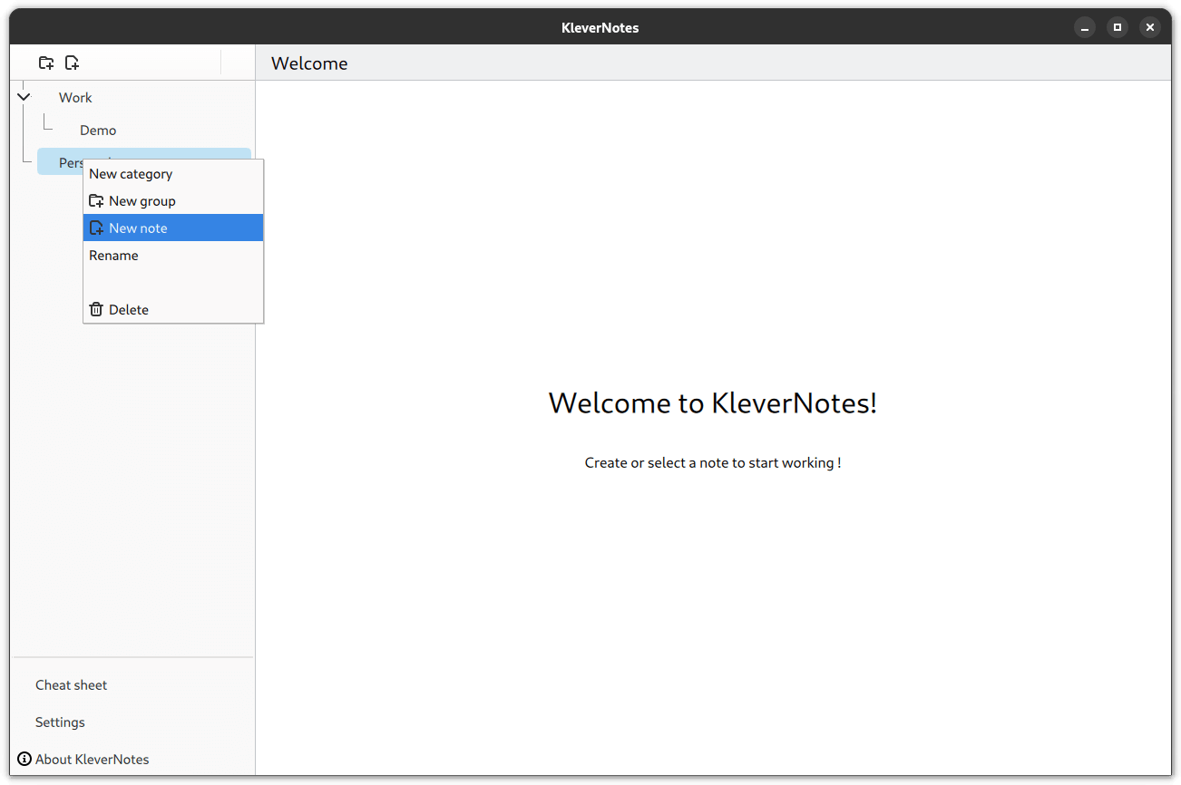 When that was set, a demo note loaded up showing me what KleverNotes could do, with relevant information on various Markdown elements. I then created two new categories by right-clicking on the existing note category and populating the new ones with some notes.