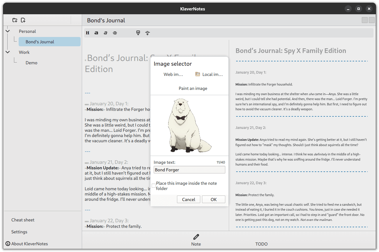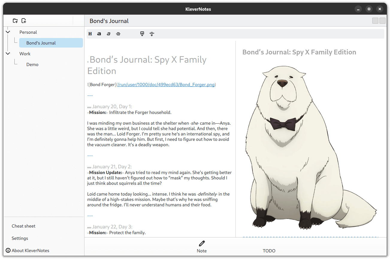 KleverNotes' note editing experience being showcased via a journal of Bond Forger.