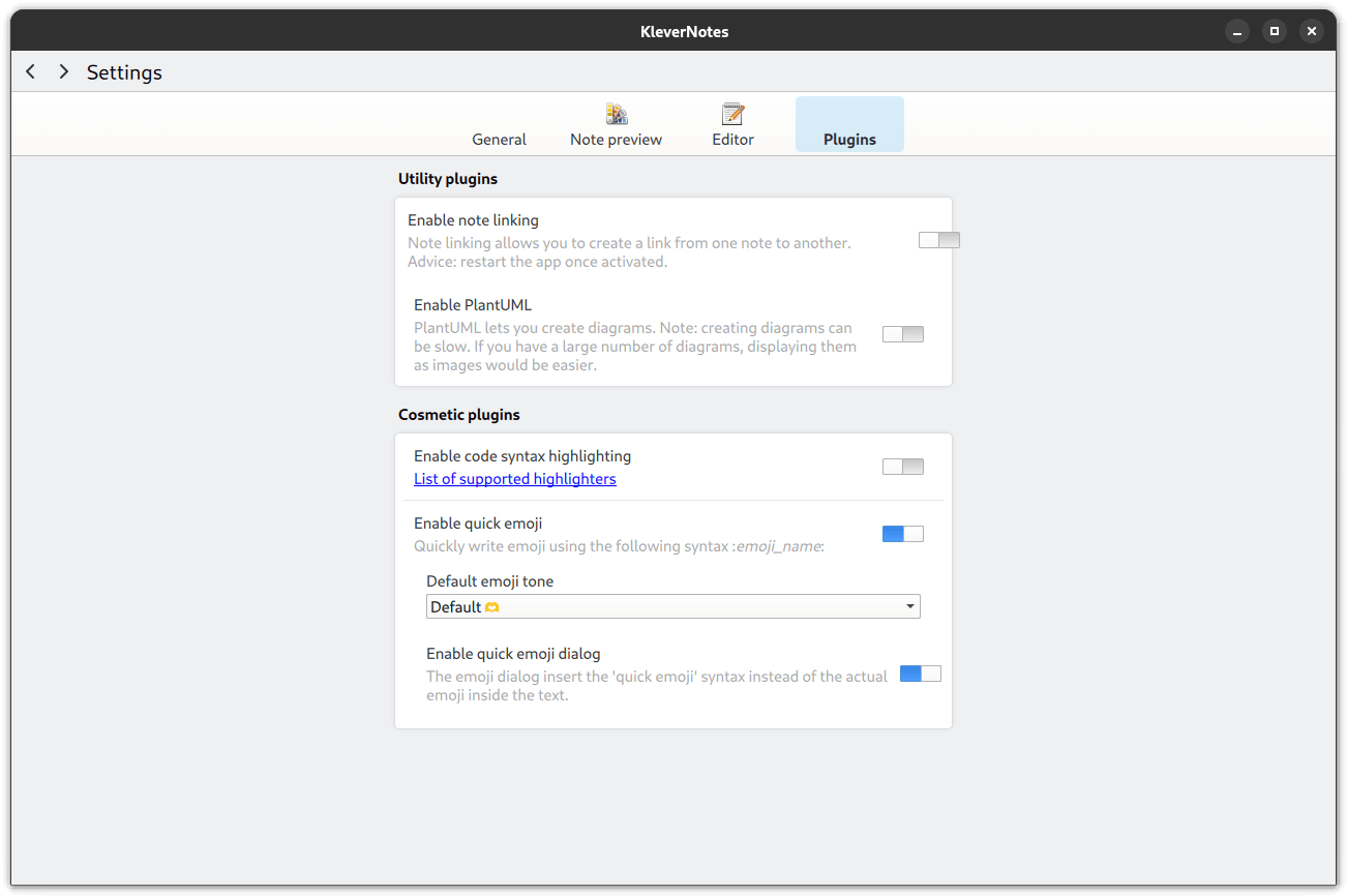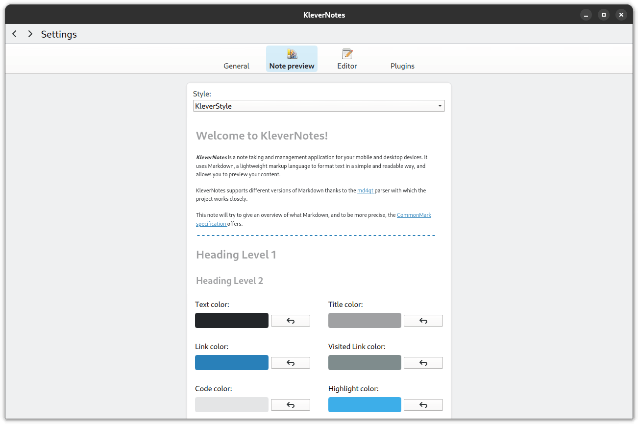 The Plugins and Note preview settings pages of KleverNotes.