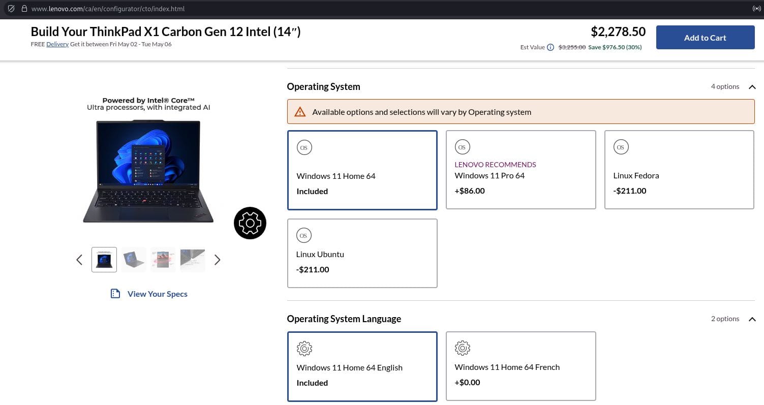 When I dug in further, I found out that the US and Canadian websites for Lenovo offered U.S. $140 and CAD $211 off on the same ThinkPad X1 Carbon model when choosing any one of the Linux-based alternatives.