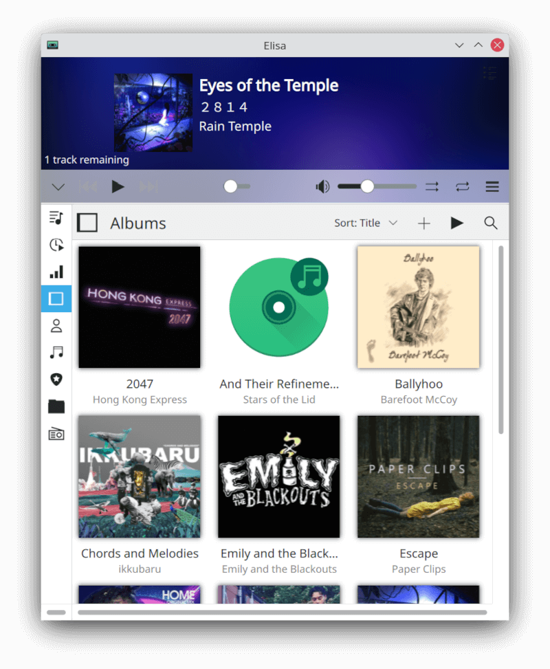 Elisa is a music player developed by the KDE community that strives to be simple and nice to use. We also recognize that we need a flexible product to account for the different workflows and use-cases of our users. We focus on a very good integration with the Plasma desktop of the KDE community without compromising support for other platforms (other Linux desktop environments, Windows, and Android).