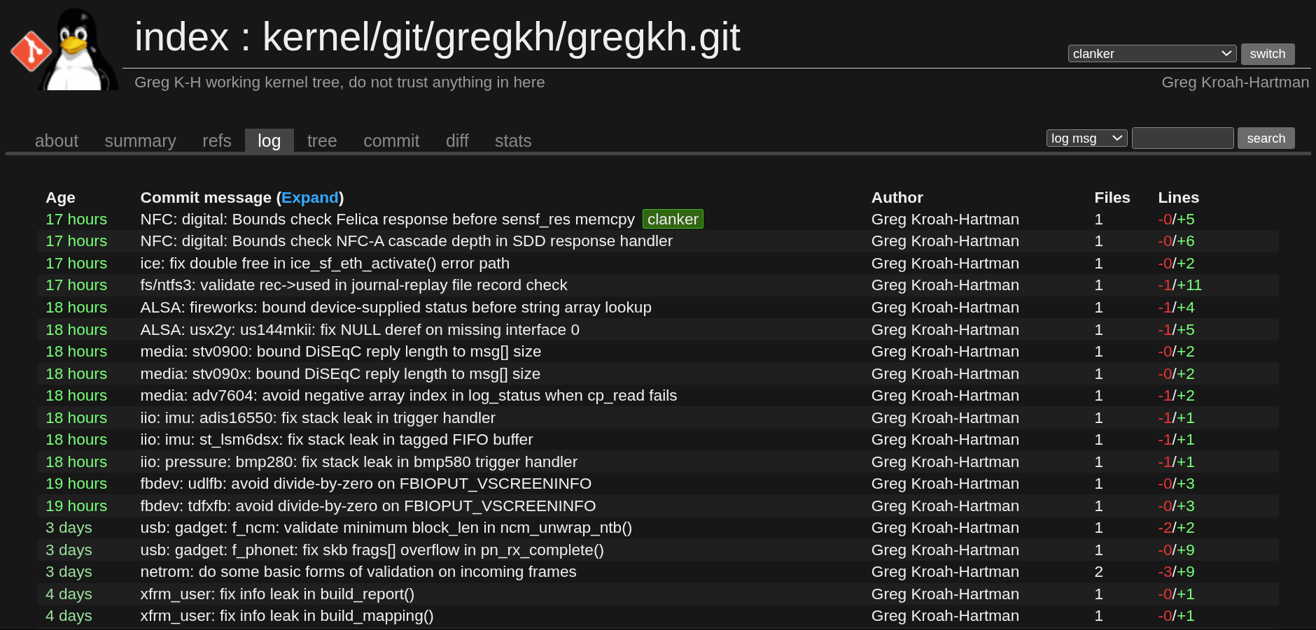 It does not stop there. The clanker branch has since accumulated patches across a wide range of subsystems, including USB, HID, WiFi, LoongArch, networking, and more.