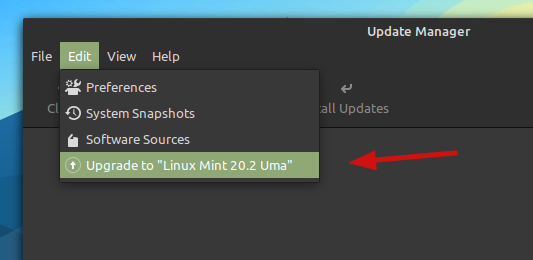 Next, make sure that you have a backup (use timeshift if you want) and then head to the Update Manager’s System Upgrade option from the Edit menu as shown below.