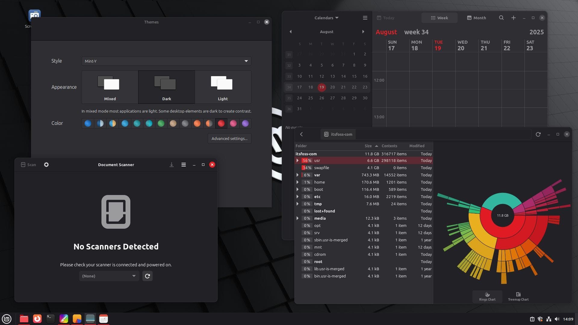 libAdwaita was patched to work with themes in this release. Support was added to the Mint-Y, Mint-X, and Mint-L themes. Plus, several applications, including GNOME Calendar, Document Scanner, and Disk Usage Analyzer, were upgraded to their libAdwaita versions.