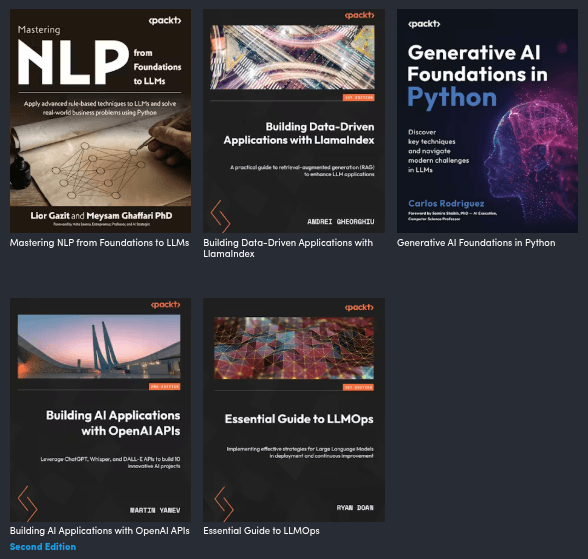For core LLM knowledge, LLM Engineer's Handbook is one of the more practical titles in the bundle, focused on building and shipping real LLM systems. LLM Design Patterns gets into architecture decisions, LLMs in Enterprise covers the deployment and organizational side, and Essential Guide to LLMOps handles keeping models running reliably once they're out in the world.