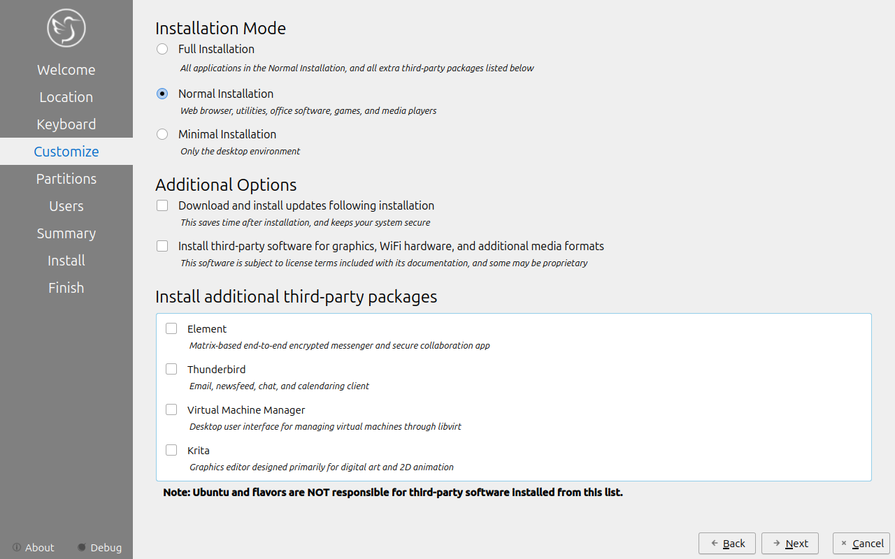 This can be found in the new βCustomizeβ menu, which also houses a βNormal Installationβ mode where all the usual apps are installed, and a βFull Installationβ mode that will install extra apps such as Thunderbird, Krita, Element, and Virtual Machine Manager.