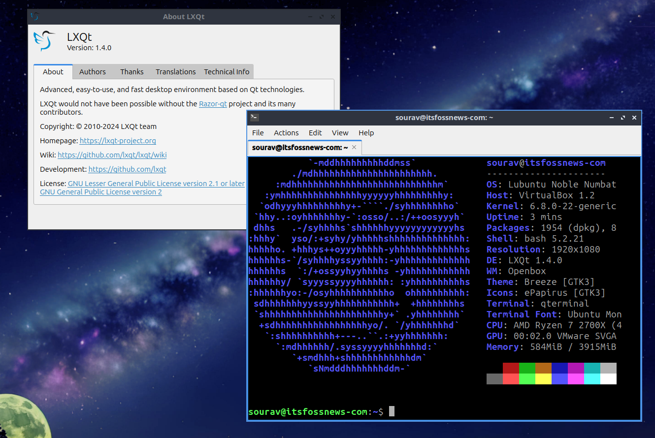 For the desktop environment, Lubuntu 24.04 LTS features LXQt 1.4.0 which is based on Qt 5.15, the last LTS version of Qt5. It comes equipped with improvements such as the image viewer having minimal support for color spaces, support for Putty-style mouse button swapping on QTerminal, refinements to the file manager, and more.