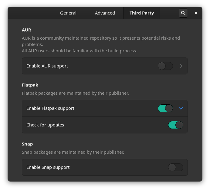 Overall, it was a pretty good experience without any slowdowns. To sweeten the experience, the package manager lets you quickly enable the support for Flatpaks/Snaps/AUR by tweaking the preferences of pamac.