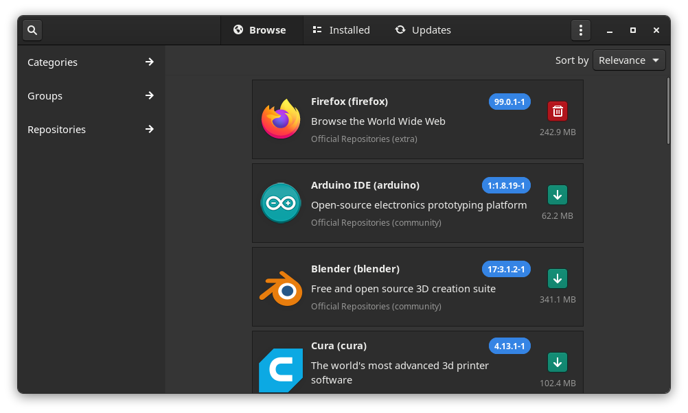 With Manjaro Linux, I found Pamac installed as the package manager. It seems to be one of the best ways to install and remove software on Manjaro Linux.