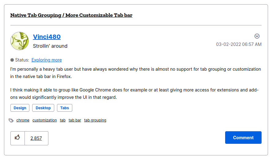BelFox went on to strengthen their case by mentioning the most requested feature on the Mozilla Connect portal that has been there since 2022! The request was to implement a native tab grouping feature or a more customizable toolbar into Firefox.