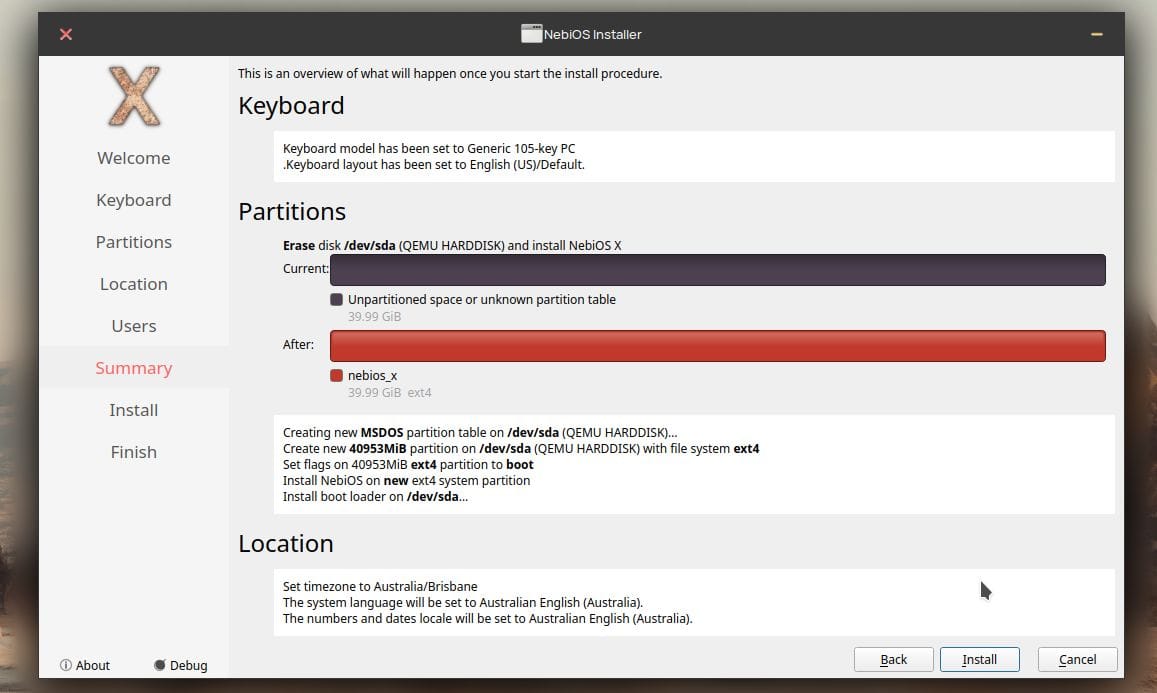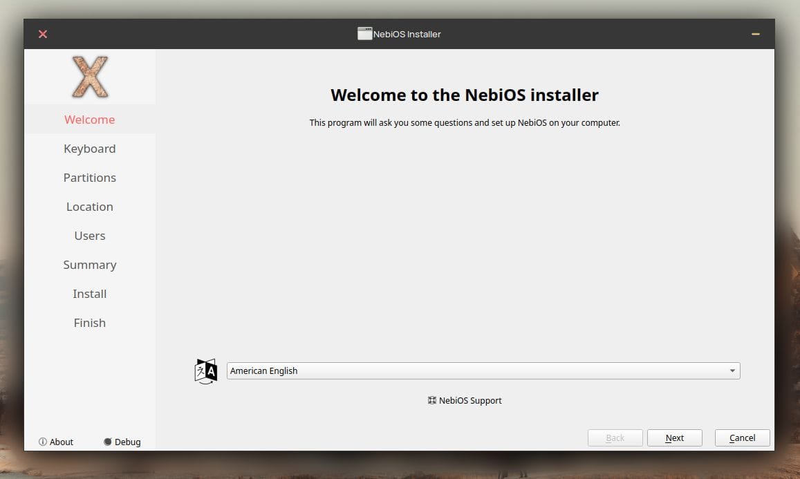 NebiOS uses the Calamares installer for system installation, which offers a clean and straightforward setup process with all the standard options like disk partitioning, user account creation, and timezone selection.