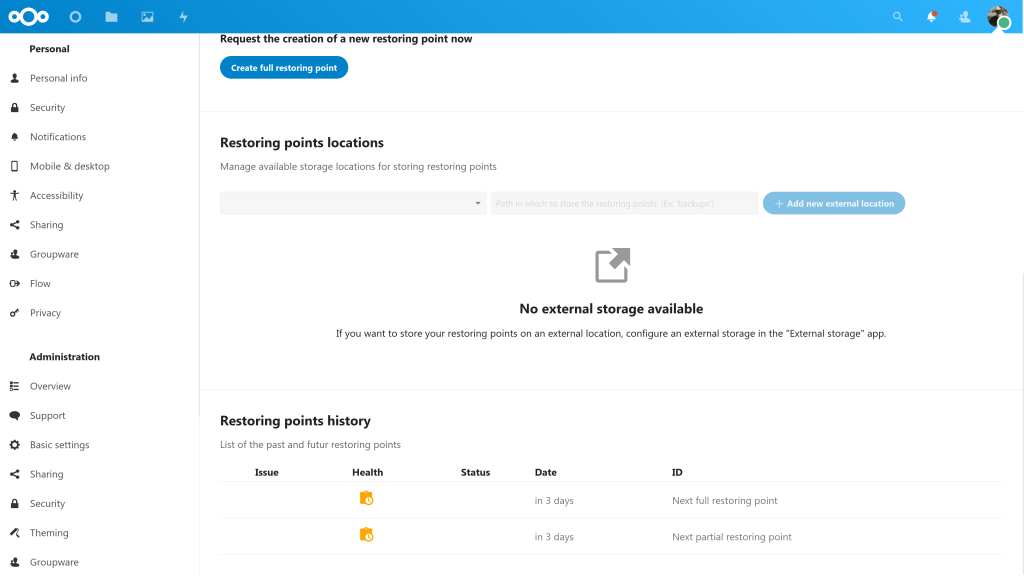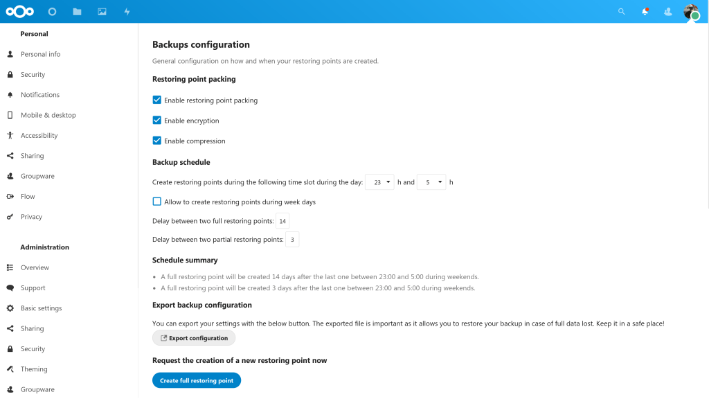 Of course, you can explore more about it if you are willing to test it. However, in general, it isn’t clear if the configuration will have a timer or if you can export it anytime before generating another backup in Nextcloud.